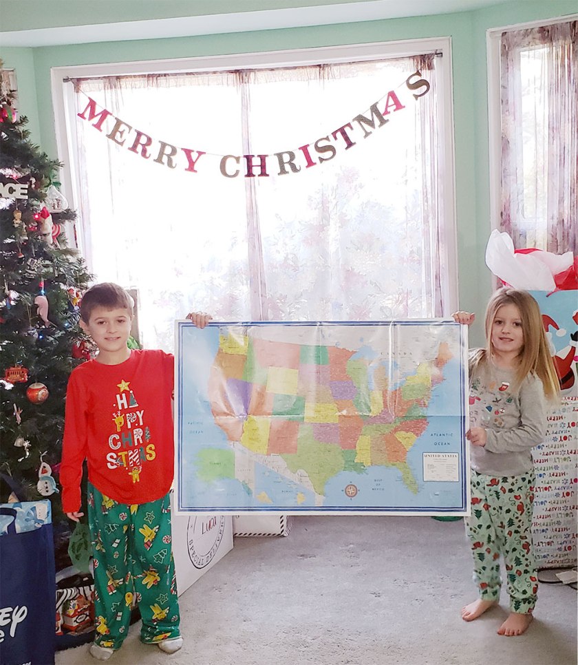 My favorite gift we gave the kids this Christmas was a map. Peanut was pretty excited about it but Diva didn’t really understand. Her brother did a great job explaining it to her. Then I did some explaining to them. We’ve done a lot of talk about traveling, but it’s time to stop talking and start going!