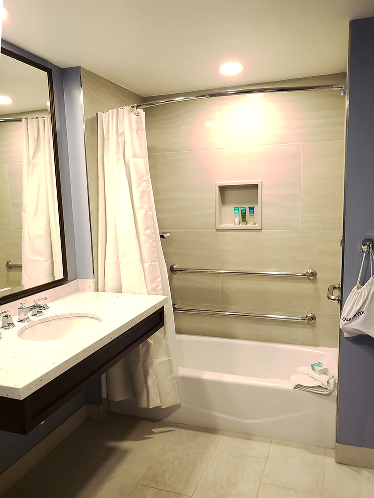 I was the first one in our room and was able to take a moment to enjoy it in peace and quiet. I was almost immediately underwhelmed though. After spending the first part of our trip in the very spacious room just across the property stepping into our Studio room was a bit of a disappointment. I immediately felt it was smaller and was searching for a place to leave our luggage. The bathroom lacked storage and separate dressing and bathing quarters, though I’m fairly certain this is because we were in a handicap accessible room. Layouts and photos I had reviewed before our stay do show the studios to have separation in the bathroom.