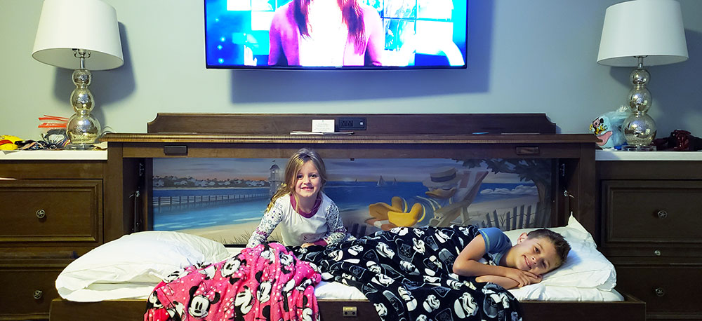 The cutest element in this room was the murphy bed! Pictures I have seen online of murphy beds across the property have hidden mini-murals of Disney characters. In person, Donald sleeping in a beach chair is even better. The kids did a little bit of fighting over which one would sleep in this bed. Ultimately Peanut negotiated a deal and got the first night. He almost conned his way into getting the second night too.