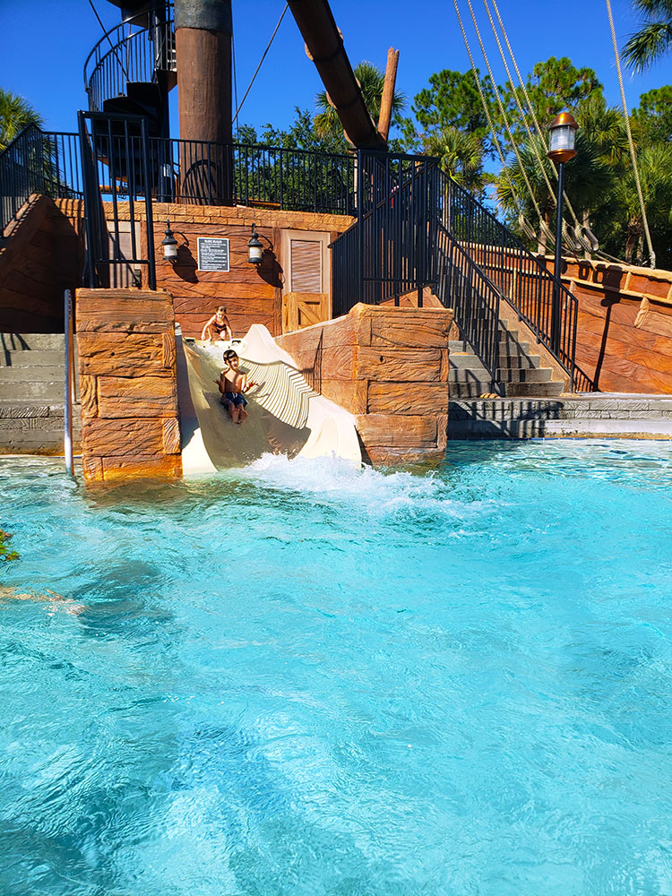We made sure to explore all areas of the pool which included a relaxing lazy river, swimming area with a volleyball net, a small cove, small hot tub, and the shipwreck with a kiddie slide and a huge slide. Diva thought about it for a minute then looked across the sidewalk to see how large it actually was and quickly changed her mind. Peanut had no interest in it at all. I’m a little bummed we didn’t get to try it at least once.
