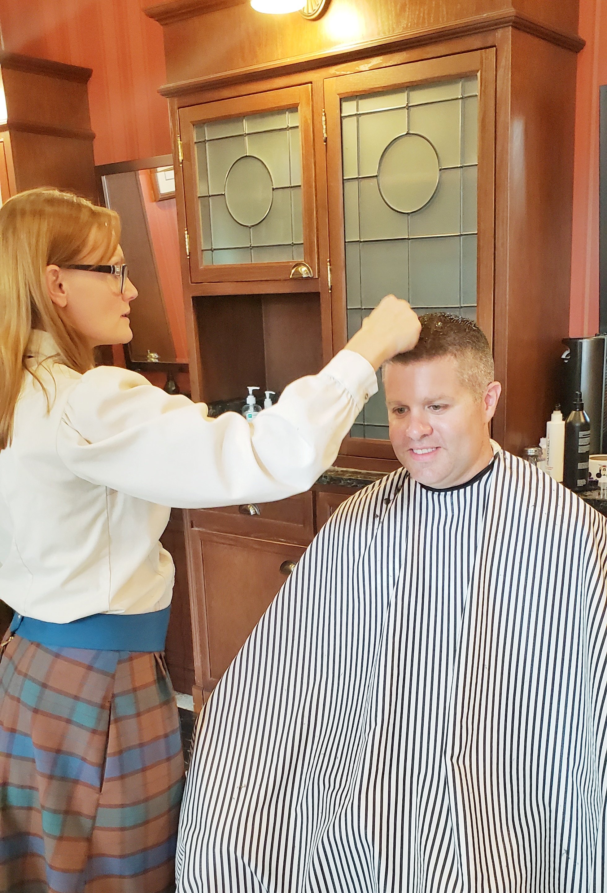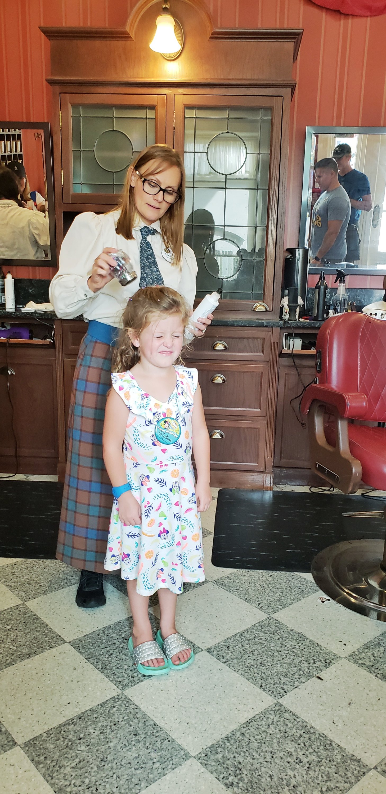 We arrived at Harmony Barber Shop as Grumpy was finishing with his haircut. I yelled “He wants extra pixie dust,” as I walked in. He quickly and adamantly replied, “No pixie dust!” Diva wanted it though! The Cast Member was so sweet and gave Diva the Pixie Dust that Grumpy had declined.