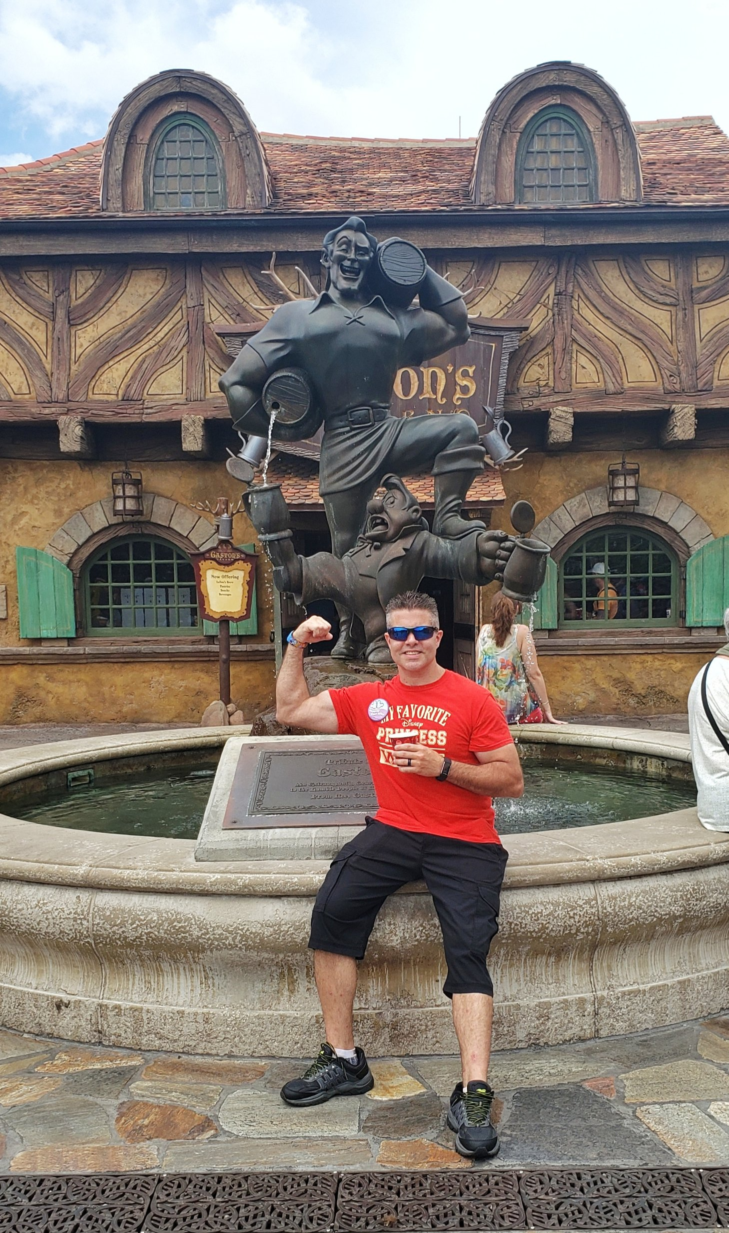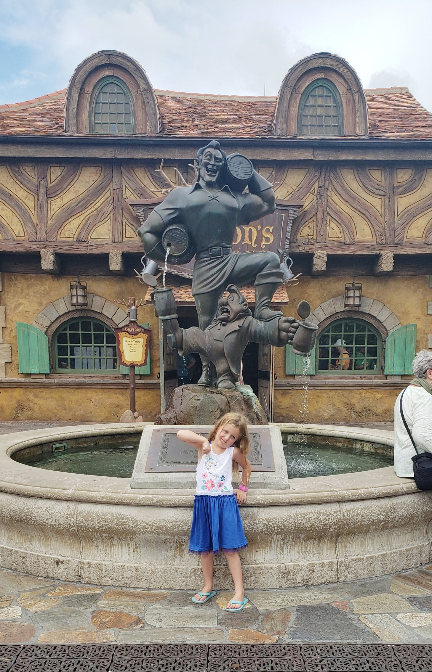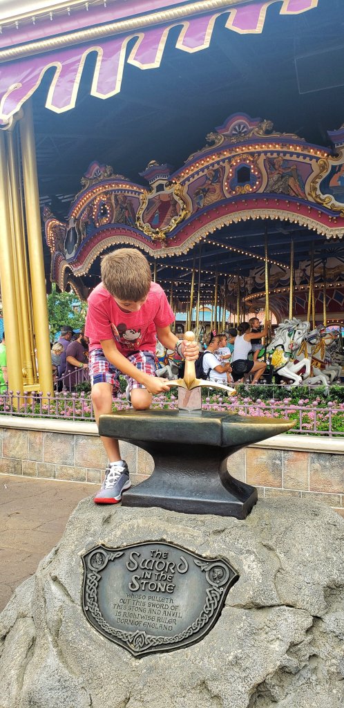 We also decided to do something we’d been avoiding on the two prior trips: ride it’s a small world! So it wasn’t that painful–but the song certainly was stuck in our head for a while. Our lunch reservation was approaching, but we had time for one quick Carousel ride and some fun pictures with the Sword in the Stone.