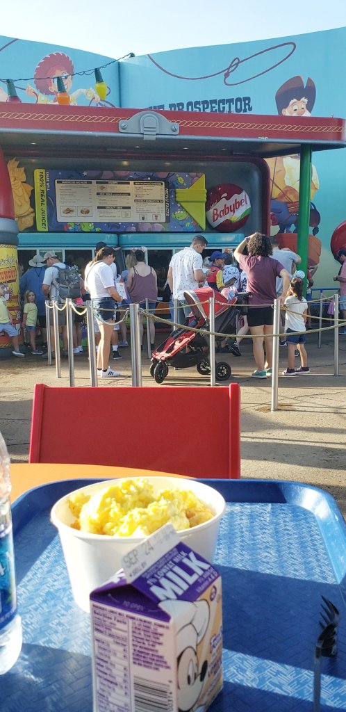 Less than 20 minutes after we arrived at the park we accomplished the mission and during our short wait decided our next stop would be Toy Story Land. Woody greeted us as we walked in! We picked up our mobile order breakfast before going swirling on Alien Swirling Saucers.