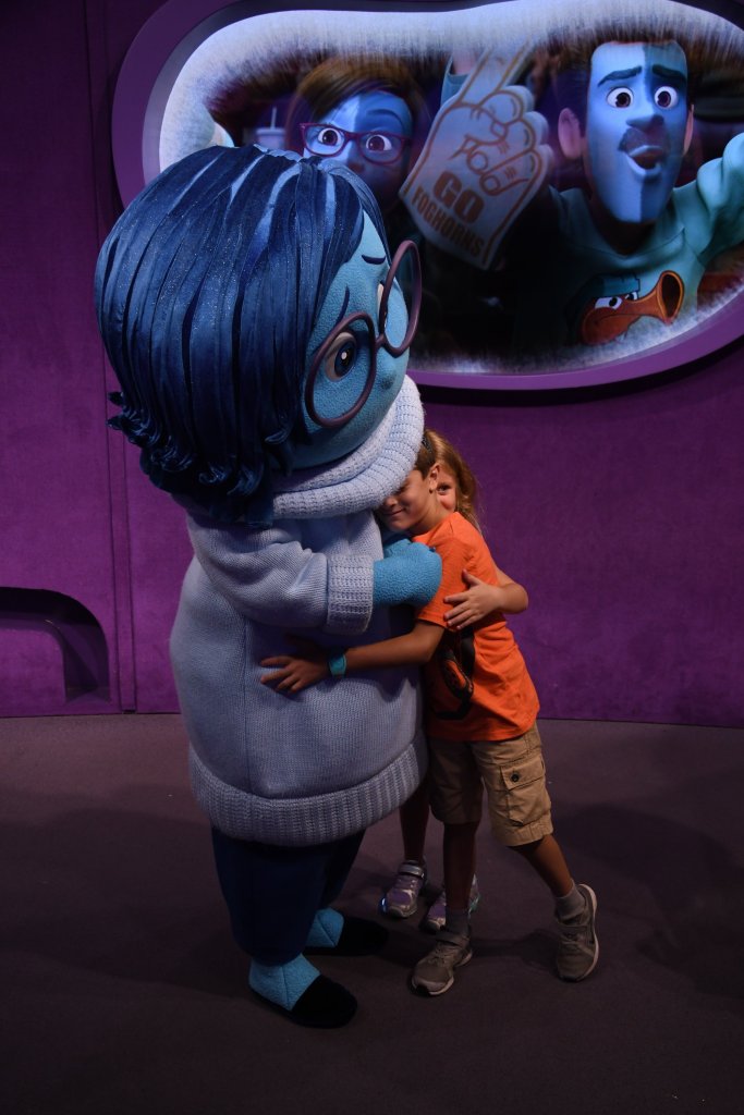 Our only plan for the park was to get lunch at Coral Reef Restaurant. We were cutting our reservation time pretty close but made it exactly on time. After lunch, we came out as it was about to pour rain. We were trying to make it out of the park and to the bus stop but it wasn’t even close. We huddled under the corridor from Future World West that houses the Character Spot. The rain was so heavy that getting ponchos out would have likely been fruitless. Without letting the kids know, I stepped away to check the wait time for Joy and Sadness. It was only about 10-15 minutes so I asked if they wanted to see them while we waited for the rain to pass.