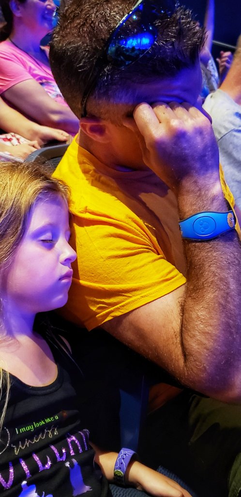 We three early afternoon FastPass+ selections for Frozen Sing-A-Long, Indiana Jones Stunt Spectacular, and Slinky Dog Dash. The only thing that was a priority was making it to Slinky Dog Dash but we arrived in time to do all three! The Frozen Sing-A-Long was a good place to start because it was really hot outside. As we stood in the FastPass line Grumpy made every attempt not to move forward until he could be in the next shaded spot. Inside, he and Diva took a nap in the cool air before the show started. She was in love with it once the cast took the stage!