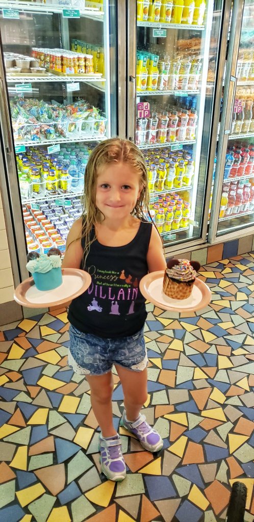It was time to rinse off the pool water. We grabbed a quick snack. The cupcakes were so hard to choose from so we went with two.