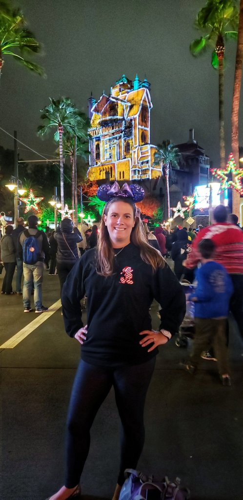 More of our group started arriving at the park. We did one final meet up in Star Wars: Galaxy’s Edge. I decided to opt out of our FastPass+ reservations to go watch Sunset Seasons Greetings, a projection show on the Hollywood Tower Hotel (Tower of Terror).