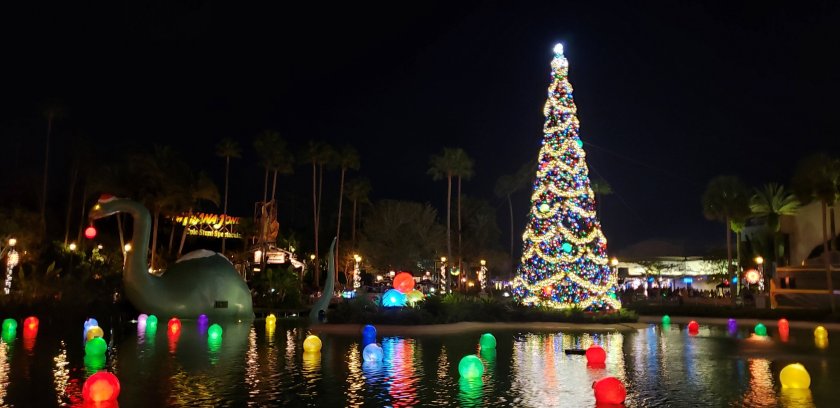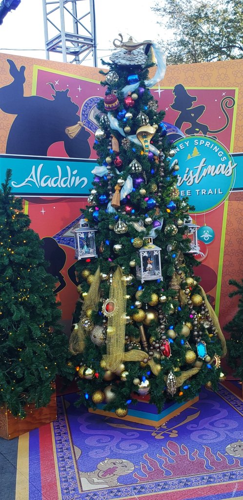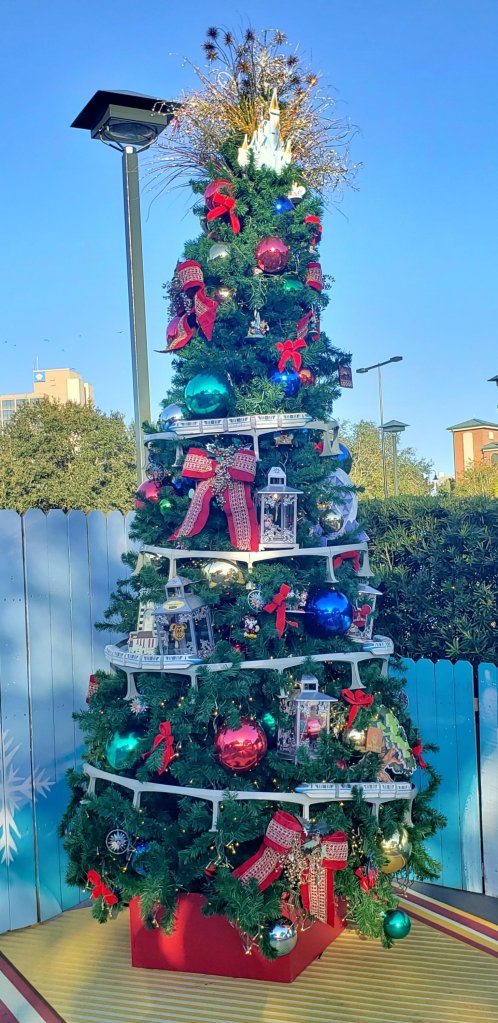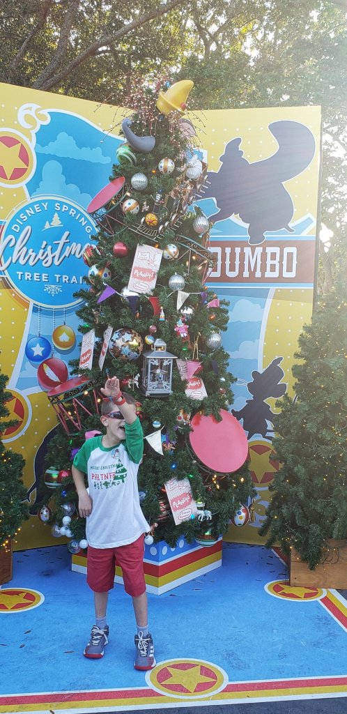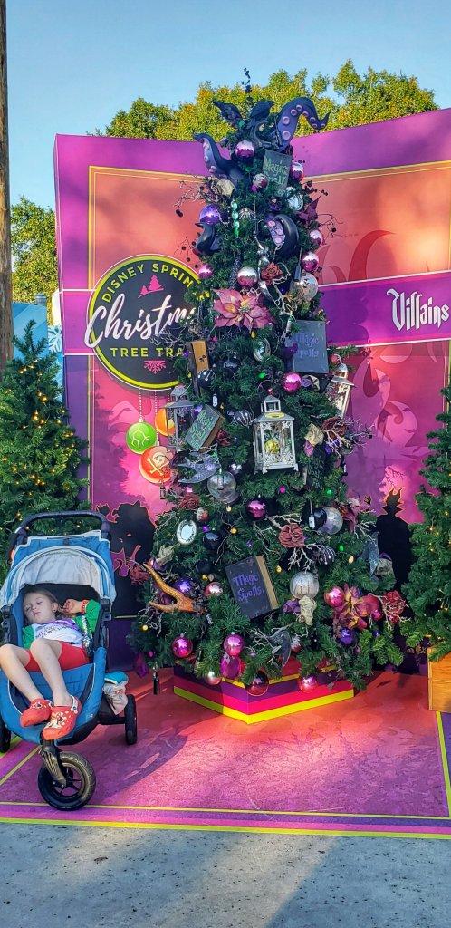 Peanut and I walked around Disney Springs, checked out World of Disney, the Lego Store, and the Pin Trading Store before going to what I really was at Disney Springs for: The Disney Springs Christmas Tree Trail! I’ve seen pictures of these trees for years and now I could finally walk the trail myself. The little Diva was fast asleep by the time we were on the trail and there was no way she was waking up. We made sure to prove she “saw” her favorite trees though by including her in some of the pictures.