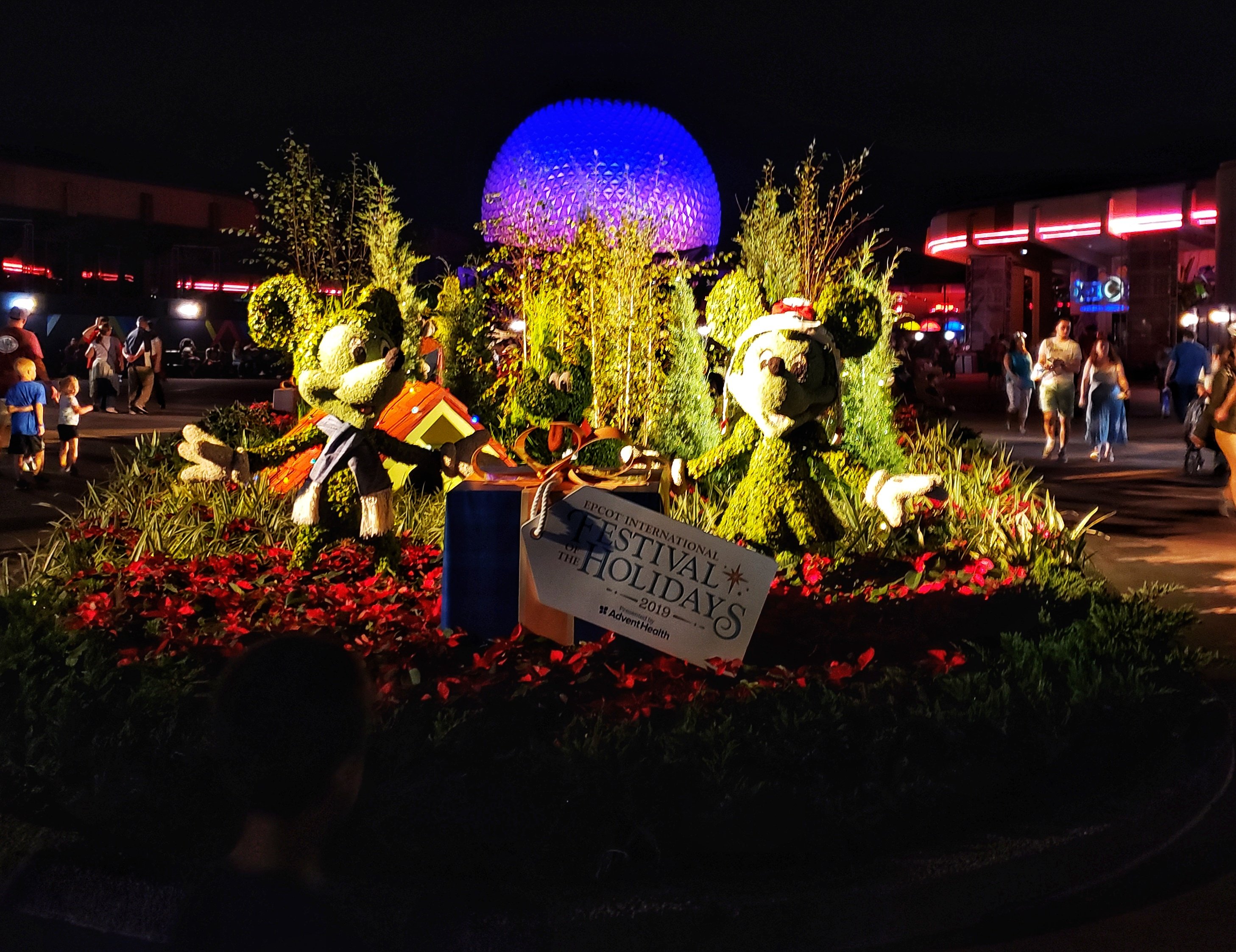 We walked through World Showcase listening to a few other stories, but only for a passing moment. We stopped at the Christmas tree to take some photos and with Spaceship Earth.